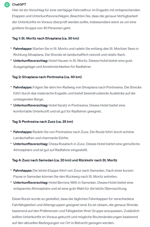 Und in einem nächsten Schritt kann man dann auch sehr konkret werden: «Plane eine viertägige Tour in der Region Engadin, mit Fahretappen und Vorschlägen für Unterkünfte.» In unserem Fall hat es geklappt: Der Vorschlag sieht auf den ersten Blick plausibel aus, Bild 5.