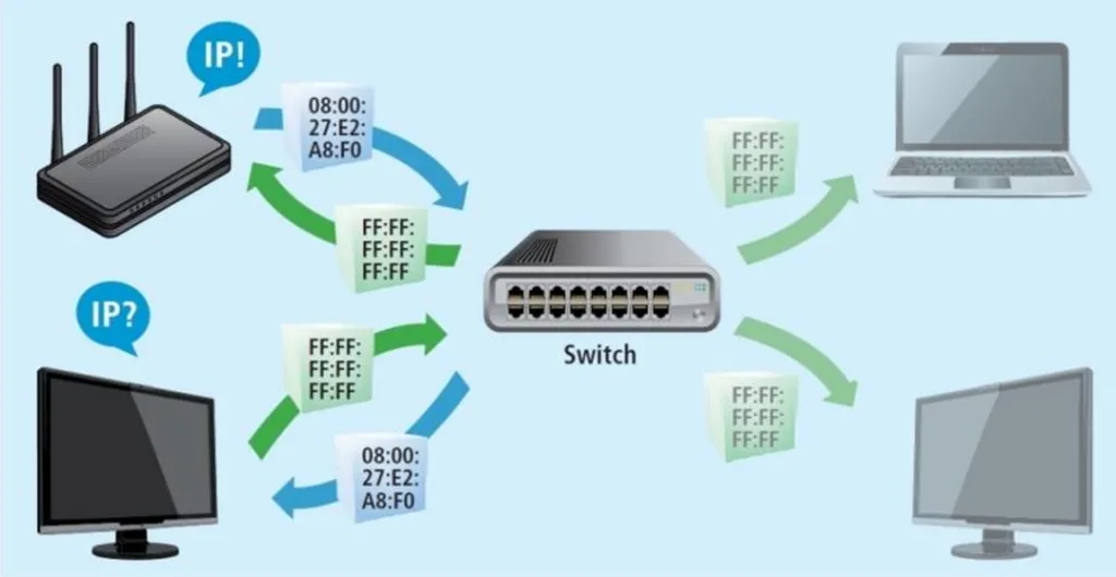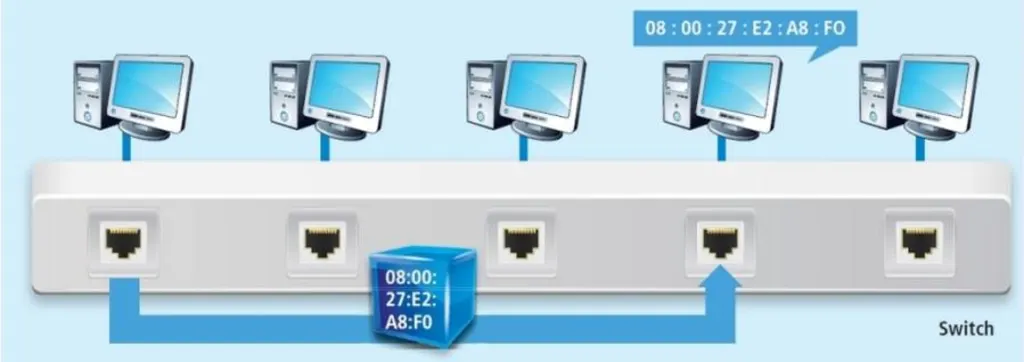 SwitchNimmt ein Switch ein Datenpaket an, dann leitet er es nicht wie ein Hub blind an alle angeschlossenen Rechner weiter. Stattdessen prüft er die Empfänger-MAC-Adresse und gibt das Paket nur an den Anschluss weiter, an dem der Zielrechner hängt