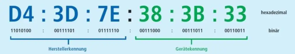 Aufbau MAC-Adressen bestehen aus einer 48-stelligen Folge von Einsen und Nullen. Der Lesbarkeit wegen werden die 48 Bit in sechs Blöcke zu je 8 Bit aufgeteilt und in hexadezimaler Schreibweise dargestellt. Als Trennsymbol zwischen den Blöcken werden Doppelpunkte, gelegentlich auch Bindestriche verwendet. Die ersten drei Blöcke bilden die Herstellerkennung, die letzten drei Blöcke die Gerätekennung