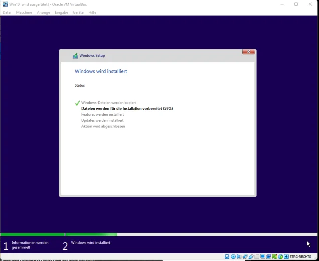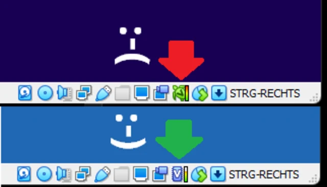 Quelle: PCtipp.chWobei mein Vorwurf «kein Hinweis» ein wenig zu relativieren ist. Schaut man sich das Fenster mit der virtuellen Maschine genauer an, findet man unten rechts möglicherweise ein Schildkröten-Symbol. Ist dieses zu sehen, verwendet Virtualbox Komponenten von Hyper-V, mit welcher z.B. auch die Windows-Sandbox läuft. Nur, wenn man den ganzen Hyper-V-Krempel aus Windows entfernt, verwendet Virtualbox die eigene Virtualisierungs-Engine, siehe das untere Icon im Bild.