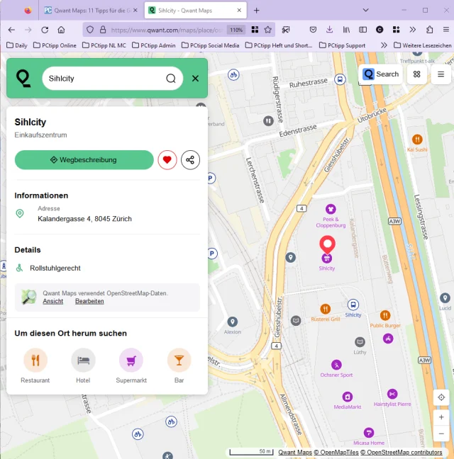 Quelle: Screenshot/PCtipp.chQwant Maps bietet bereits viel, auf ein paar Dinge müssen Google-Maps-Gewohnte allerdings verzichten. Unsere Tipps finden Sie unten in der Bildergalerie (klicken zum Vergrössern).