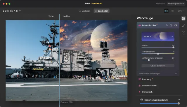 Luminar spielt mit der Realität. So lässt sich mit wenigen Klicks der Himmel durch einen anderen ersetzen, wobei die Lichtstimmung und sogar die Spiegelungen der Wolken berücksichtigt werden. Bei Porträts werden auf Wunsch die Lippen intensiviert, die Augen aufgehellt oder die Zähne gebleicht. Die neuste Funktion «Porträt mit Bokeh A.I.» erkennt ausserdem einzelne Personen und sogar Gruppen, maskiert sie in einer hervorragenden Qualität und lässt den Hintergrund in der künstlichen Unschärfe verschwimmen.