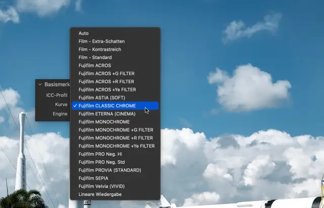 Bei RAW-Dateien werden hingegen keine Farbprofile angewendet; die Bilder wirken blass und leblos. Doch genau das ist der Vorteil, weil anschliessend eigene Farbprofile angewendet werden können, die zum Beispiel die analogen Kodak- oder Fuji-Filme simulieren. Die Farbanpassung kann über Kameraprofile erfolgen, wie hier in der Software Capture One: