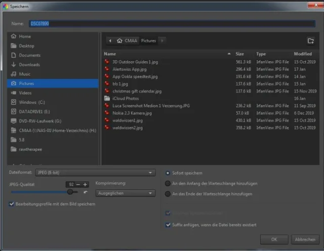 Quelle: Screenshot/PCtippSie können das Dateiformat wählen – JPEG, Tiff oder PNG –, die Qualität und Komprimierung und ob das Bild sofort gespeichert werden oder der Warteschlange hinzugefügt werden soll.