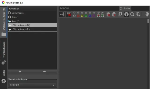 Beim ersten Start wird links die Registerkarte Dateiverwaltung sichtbar. Zuoberst sehen Sie die Favoritenleiste, darunter den Dateibrowser (Baumdarstellung). Suchen Sie über die Verzeichnishistorie nach Ihrem Ordner respektive Ihrer Datei.