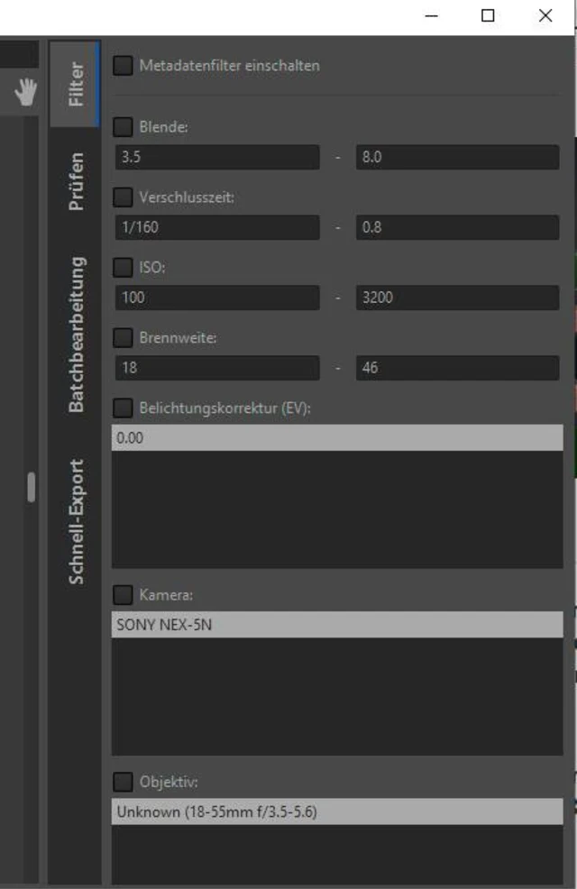 Des Weiteren können Sie auch nach Blende oder ISO filtern. Oder bei der Verwendung mehrerer Kameras auf das gewünschte Modell. Oder nach Objektiv etc.