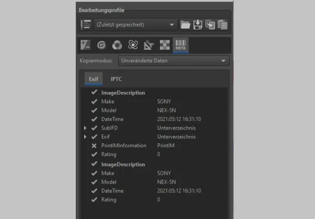 Grundsätzliche Informationen zu Ihrem Bild finden Sie hier. Beispielsweise die Marke und das Modell der Kamera, mit der das Bild aufgenommen wurde (in unserem Beispiel eine Sony Nex-5N).