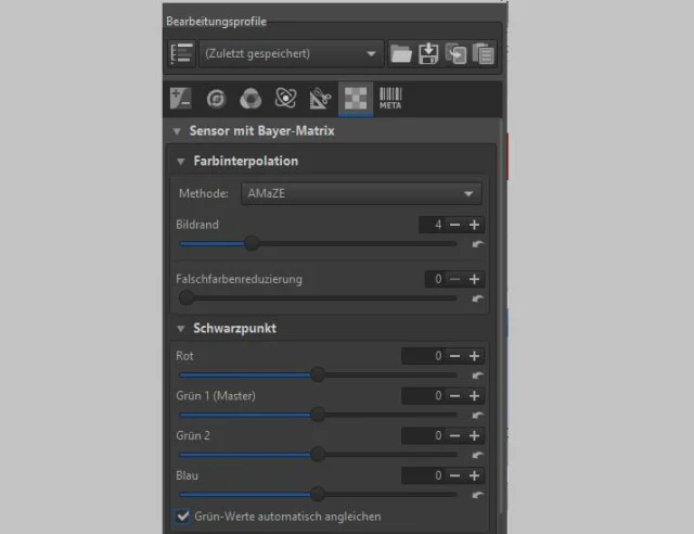 Unter dieser Registerkarte finden sich Lokaler Kontrast, Kantenschärfung, Mikrokontrast, Impulsrauschreduzierung oder Rauschreduzierung.