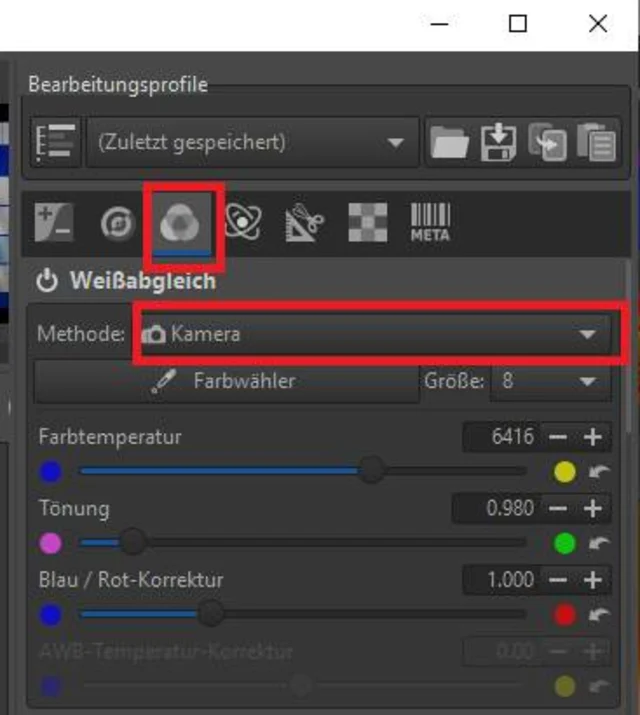 Alternativ gibt es den Farbwähler. Damit können Sie in einen Bereich des Bildes klicken, den Sie als Weissabgleich (Farbtemperatur) definieren möchten.