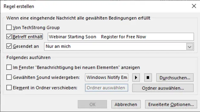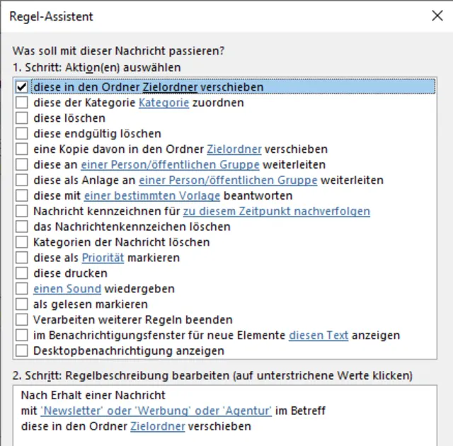 Als Aktion definieren Sie diese in den Ordner Zielordner verschieben und bestimmen, welcher der Zielordner sein soll. So können Sie etwa interne E-Mails in einen bestimmten Ordner verschieben.