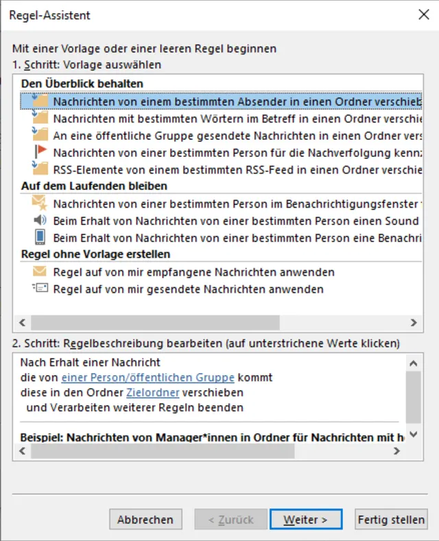 Für die gängigsten E-Mail-Regeln bietet Outlook acht vorgefertigte Vorlagen. Fünf davon befinden sich in der Kategorie Den Überblick behalten und drei stehen unter Auf dem Laufenden bleiben zur Verfügung. Damit können Sie beispielsweise beim Erhalt einer Nachricht von einer bestimmten Person einen Sound wiedergeben oder Nachrichten von einem bestimmten Absender in einen beliebigen Ordner verschieben.Im ersten Schritt wählen Sie die gewünschte Regel aus. Nun passen Sie die Regelbeschreibung Ihren Anforderungen entsprechend an. Optional können Sie weitere Bedingungen hinzufügen oder Ausnahmen definieren. Jetzt benennen Sie die Regel und schliessen die Konfiguration mit Fertig stellen ab.
