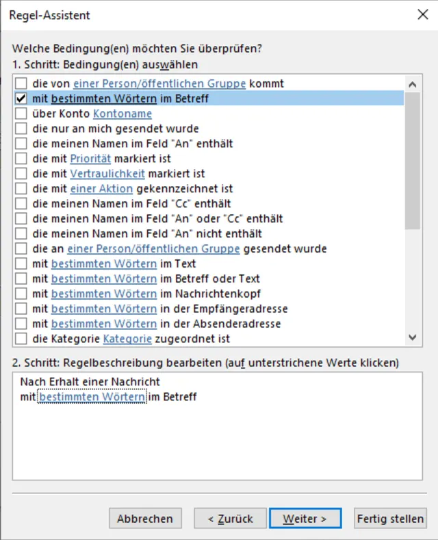 Bild 5: Die Bedingungen entscheiden darüber, welche Mails von der Regel betroffen sind