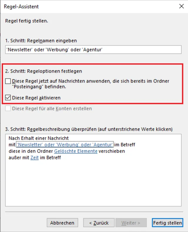 Bild 8: Im letzten Schritt aktivieren Sie die Regel und wenden sie sofort auf E-Mails im Posteingang an