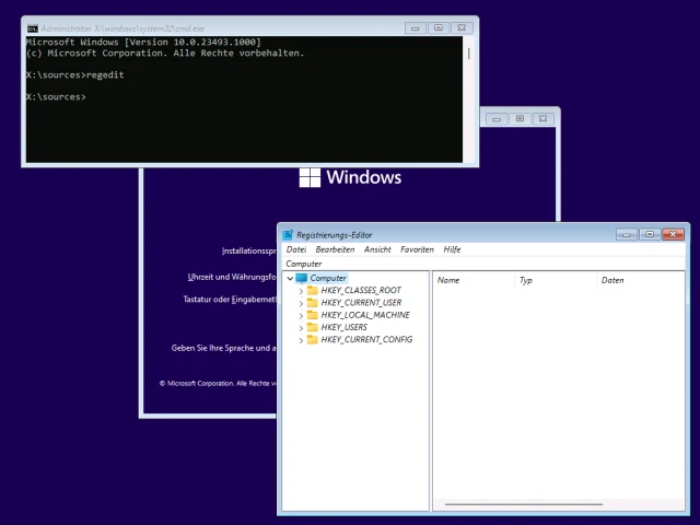 Lösung: Der Vorgang ist grundsätzlich genau derselbe. Beim Aufstarten ab einem USB-Stick oder einer DVD lädt sich eine Art Windows-Grundsystem in den Arbeitsspeicher. Sobald Sie können – und dies ist bereits bei der Sprach- oder Länderauswahl –, drücken Sie Shift+F10 (Umschalt+F10), um eine Eingabeaufforderung zu öffnen. Tippen Sie hier regedit ein und drücken Sie Enter, wird sich der Registry-Editor öffnen. Und ab da gehts grundsätzlich gleich wie im anderen Artikel beschrieben: Erstellen Sie den Registry-Eintrag und setzen Sie die Installation fort. Es müsste jetzt klappen.