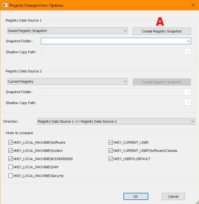 Quelle: PCtipp.chLassen Sie nach dem Erstellen des ersten Schnappschusses nicht zu viel Zeit verstreichen, weil sonst Hintergrunddienste, Virenscanner und mehr in der Zwischenzeit zu viele Einträge ändern, die Sie nicht interessieren. Nehmen Sie also umgehend die Programminstallation oder Einstellungsänderung vor, deren Registry-Änderungen Sie inspizieren wollen. Wechseln Sie wieder zu RCV oder starten Sie es. Im grossen grauen Fenster ist oben (bei «Registry Data Source 1») der erste Snapshot eingetragen. Falls nicht, wählen Sie ihn übers Ausklappmenü hinter «Snapshot Folder» aus. Jetzt könnten Sie den ausgewählten Snapshot mit einem neuen Snapshot vergleichen – oder mit dem aktuellen Zustand der Registry. Für Letzteres achten Sie darauf, dass bei «Registry Data Source 2» der Eintrag Current Registry ausgewählt ist. Lassen Sie die Zweige im unteren Teil des Fensters weiterhin angehakt. Klicken Sie auf OK und geben Sie RCV ein paar Sekunden Zeit.