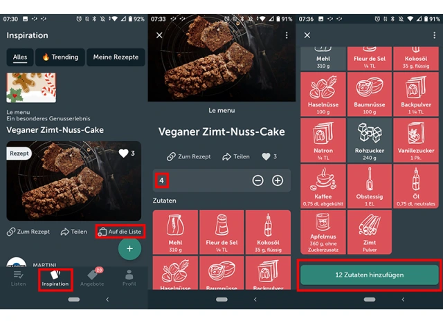 - Der ganz schnelle Weg: Sie kennen das Rezept und wollen sofort loslegen. Tippen Sie auf die Registerkarte Inspiration, und unterhalb des Rezepts tippen Sie auf Auf die Liste. Scrollen Sie ganz nach unten und tippen auf X Zutaten hinzufügen.