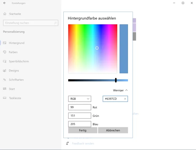 Windows kann sowohl mit RGB- als auch mit HTML-/HEX-Farbcodes umgehen. Damit eignet sich der Desktophintergrund-Farbwähler auch als Umrechner zwischen den Formaten