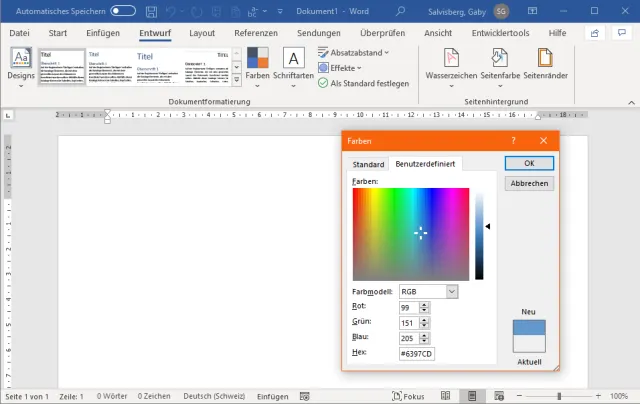 Ist Microsoft Office installiert? Auch hier geht es nur darum, den Farbwähler aufzurufen; Sie müssen die Farbe dann nicht übernehmen. Öffnen Sie zum Beispiel Word mit einem leeren Blatt und wechseln Sie zum Reiter Entwurf. Bei Seitenhintergrund klicken Sie auf Seitenfarbe und wählen Weitere Farben. Wechseln Sie zum Reiter Benutzerdefiniert. Und voilà: Sie haben den kleinen Farbumrechner vor sich. Sobald Sie den gewünschten Farbcode ermittelt haben, klicken Sie auf Abbrechen.