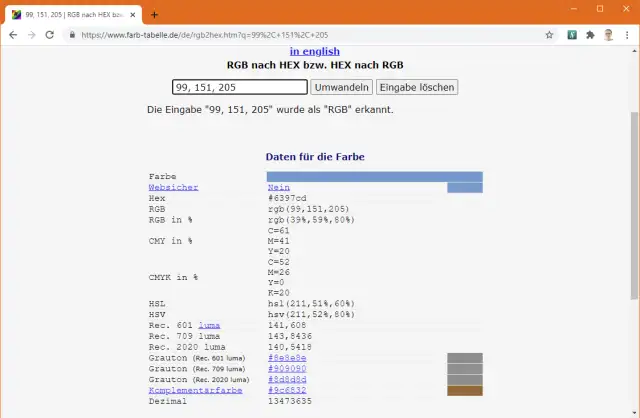 Es gibt auch Websites, die das Umrechnen anbieten. Surfen Sie zum Beispiel zu dieser Adresse https://www.farb-tabelle.de/de/rgb2hex.htm. Tippen Sie im Feld unter «RGB nach HEX bzw. HEX nach RGB» beispielsweise 99, 151, 205 ein und klicken Sie auf Umwandeln. Schon zeigt die Seite ausführliche Infos zu genau dieser Farbe an, so etwa die Hex- und RGB-Farbwerte und sogar die CMYK-Werte, wie sie in der Druckbranche üblich sind. Der Webdienst zeigt sogar an, welches die Komplementärfarbe der abgefragten Farbe ist. Damit ist jene gemeint, die dieser Farbe im Farbkreis exakt gegenüberliegt. Definitiv ein Bookmark-Tipp!