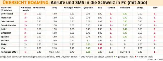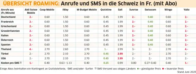 Wer aus dem Ausland in die Schweiz anruft, muss je nach Aufenthaltsort zwischen 45 Rappen und 1 Franken bezahlen. Das ist im Vergleich sehr preiswert. Eine SMS kostet auch nur günstige 25 Rappen.