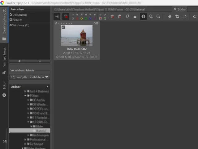 Installieren und starten Sie Raw Therapee. Die Software erhalten Sie wie erwähnt unter der Internetadresse rawtherapee.com. Links sehen Sie mehrere Reiter. Der oberste ist die Dateiverwaltung. Klicken Sie darauf und navigieren Sie in einen Ordner mit RAW-Dateien. Wenn die Bilder im Hauptfenster nicht automatisch auftauchen, klicken Sie doppelt auf den Namen des Ordners, Bild 9.