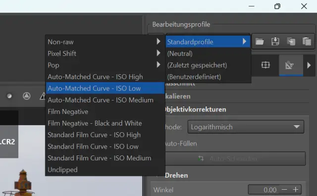 Statt einfach immer nur an verschiedenen Reglern zu ziehen, können Sie auch auf eine Reihe mitgelieferter Profile zurückgreifen und von dort aus weitere Anpassungen vornehmen. Sie finden diese ganz oben unter Bearbeitungsprofile. Öffnen Sie das Menü und wählen Sie erst Standardprofile und danach zum Beispiel Auto-Matched Curve – ISO Medium aus, Bild 11. Wenn Sie später lieber wieder von vorn anfangen wollen, wählen Sie die Option (Neutral) aus dem Menü aus. Über die kleinen Schaltflächen rechts laden Sie weitere Profile oder speichern Ihre aktuelle Bearbeitung als neues Profil ab.