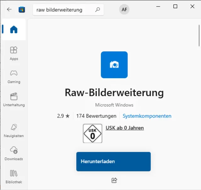 Standardmässig kann Windows Dateien im RAW-Format nicht öffnen oder anzeigen. Redmond bietet deswegen im Microsoft-Store die Software «Raw-Bilderweiterung» zum kostenlosen Download an, Bild 6. Microsofts Windows 10 enthält sie in der Regel noch nicht, unter Windows 11 wurde sie unter Umständen bereits automatisch installiert. Eventuell haben Sie auch schon