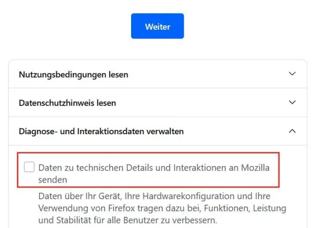 Bild 3: Entfernen Sie beim Set-up das Häkchen vor dem Eintrag Daten zu technischen Details undInteraktionen an Mozilla senden