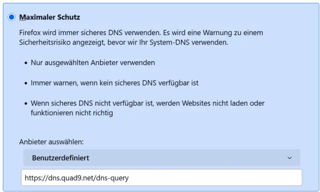 Standardmässig bietet Firefox auch bei der Einstellung Maximaler Schutz zunächst aber den US-DNS-Anbieter Cloudflare an. Wählen Sie deshalb Benutzerdefiniert aus und tragen Sie in das Feld einen alternativen DNS-Anbieter ein. Unter dem Link privacy-handbuch.de/handbuch_21w.htm finden Sie eine Liste vertrauenswürdiger DNS-Provider. Manche wie Quad9 haben eine Besonderheit, da sie auch gleich Malware ausfiltern. Um Quad9 zu aktivieren, tippen Sie in das Feld https://dns.quad9.net/dns-query ein, Bild 6. Damit sind die Konfigurationsmöglichkeiten in der grafischen Oberfläche von Firefox weitgehend ausgeschöpft.