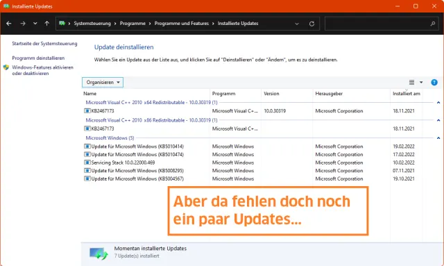 Öffnen Sie via Start und Eintippen von System die Systemsteuerung. Gehen Sie darin via Programme zu Installierte Updates anzeigen. Da treffen Sie vielleicht gerade mal auf eine Handvoll Updates. Jenes, über das wir Bescheid wissen wollten, finden wir hier nicht. Keine Spur von KB5010386, das uns hier als Beispiel dient.