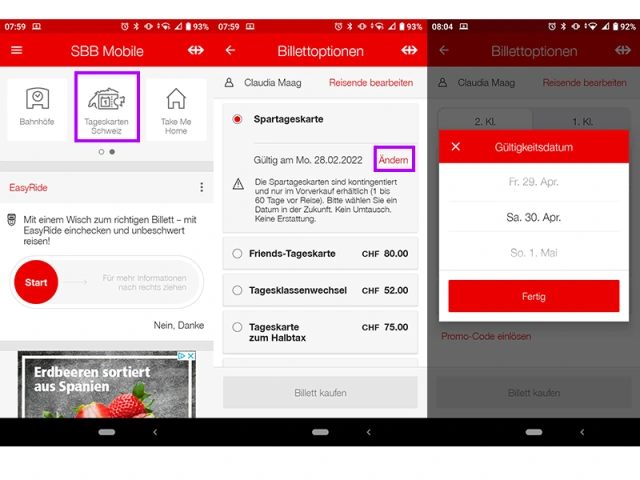 In der SBB-Mobile-App können Sie Tageskarten kaufen; für eine gewisse Zeitspanne auch Spartageskarten.