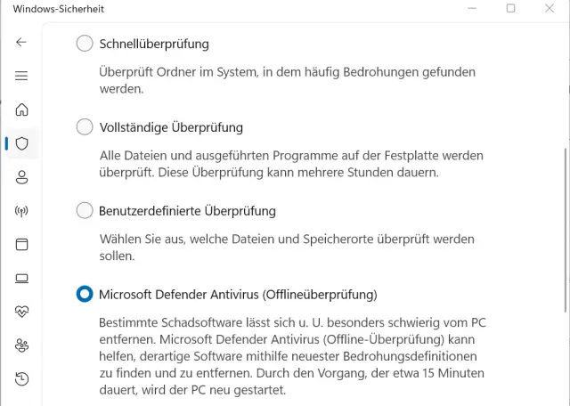 Sowohl in Windows 11 als auch in dem Vorgänger Windows 10 hat Microsoft einen Offline-Virenscan eingebaut, mit dem Sie eine gründliche Suche nach Schädlingen durchführen. Unter Windows 11 rufen Sie das Menü Start/ Einstellungen/Datenschutz und Sicherheit/Windows-Sicherheit/Viren- und Bedrohungsschutz/Scanoptionen auf und wählen danach Microsoft Defender Antivirus (Offlineüberprüfung) aus, Bild 8. Ein Klick auf Jetzt überprüfen startet den Computer neu und führt den Virenscan anschliessend durch. Der Klickpfad in Windows 10 ist nahezu identisch.