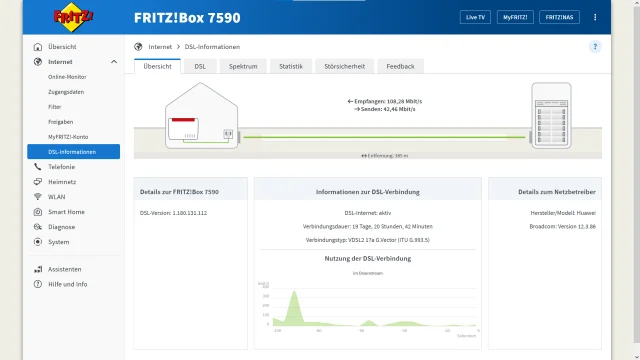 In Ihrem DSL- oder Kabel-Router erfahren Sie, mit welcher Geschwindigkeit Sie mit Ihrem Provider verbunden sind. Stimmt die dortige Angabe mit dem gebuchten Tarif überein? Am Beispiel einer Fritz!Box zeigen wir, wie Sie die Bandbreite kontrollieren. Loggen Sie sich in der Verwaltungsoberfläche des Routers ein. Eine Fritz!Box erreichen Sie im Webbrowser über die Adresse fritz.box. Aktuelle FritzOS-Versionen zeigen die Bandbreite gleich auf der Startseite der Verwaltungsoberfläche, Bild 9.