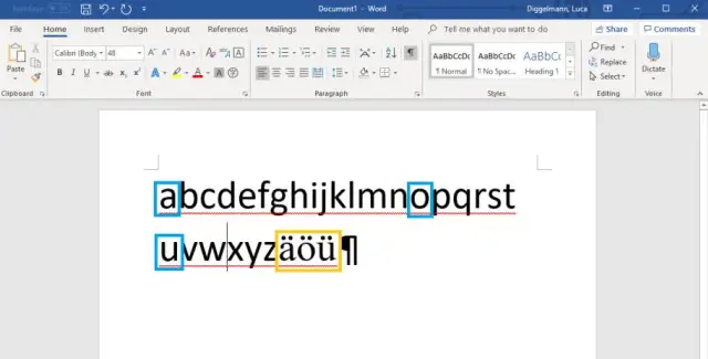 Bei näherer Prüfung stellen Sie fest: Obwohl als Standardschrift eigentlich Calibri eingestellt ist, formatiert Word die besagten Zeichen mit der Schriftart Times. Sie erkennen den Unterschied zwischen den blau und orange markierten Buchstaben im folgenden Screenshot.