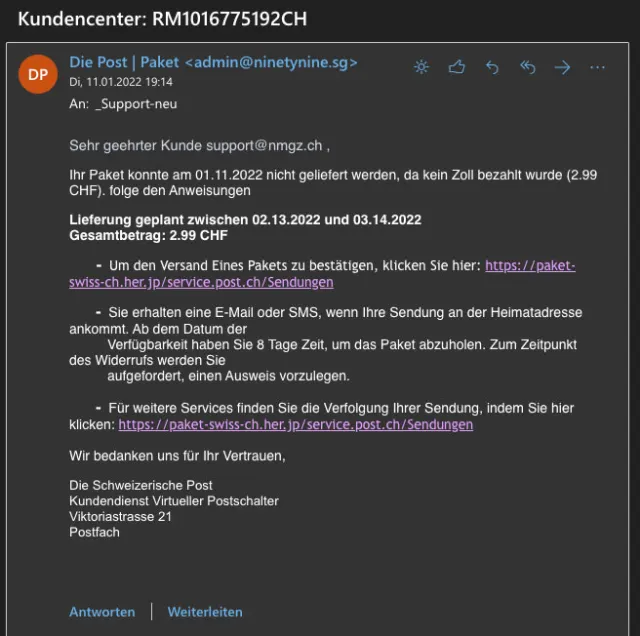 Oder: Die Post verlangt Einfuhrgebühren, die man über einen Link begleichen kann. Tippen Sie post.ch in die Adresszeile Ihres Browsers und loggen Sie sich mit Ihrem Post-Nutzerkonto ein. Ist dort eine Rechnung vorhanden, war alles okay.