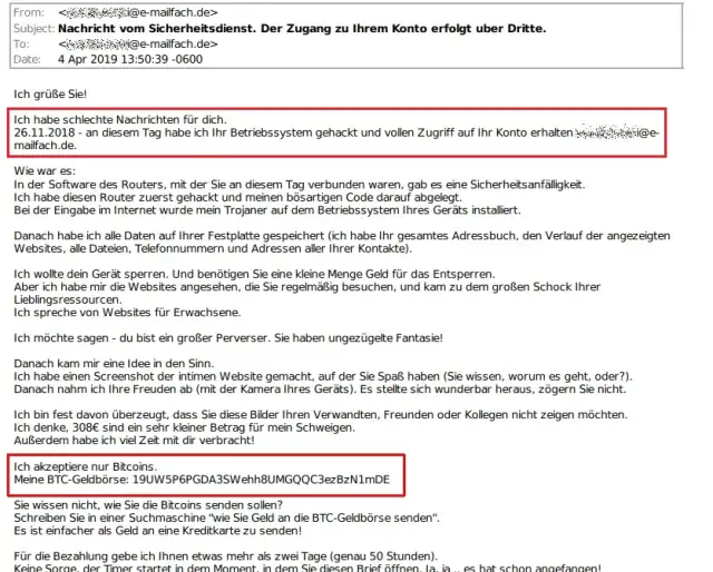 Bild 1: In dieser E-Mail wird behauptet, dass man Sie gehackt hätte. Unsinn! Einfach löschen