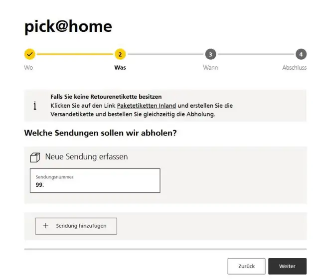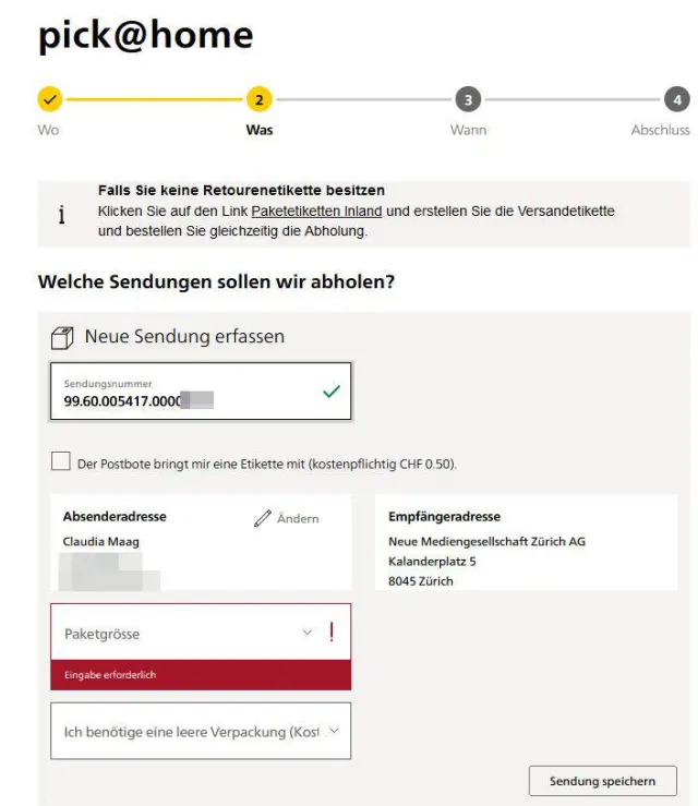 Hinweis 1: Sie müssen mindestens am Abend zuvor online einen Abholauftrag erstellen. Hierfür wird ein Kundenlogin der Post benötigt. Der Dienst ist nur kostenlos, wenn Sie bereits eine bestehende Retourenetikette mit einer Sendungsnummer haben haben.