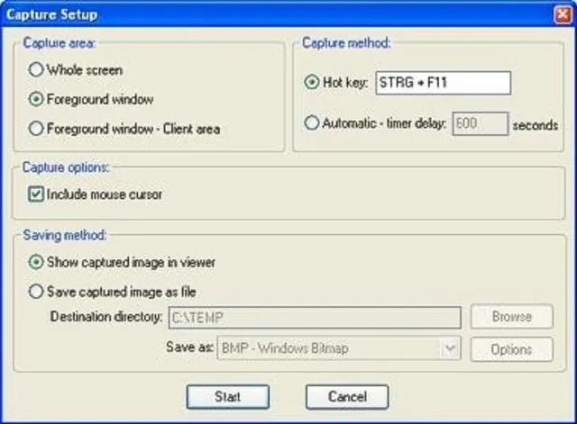Im Capture-Setup können Sie nun einstellen, ob Sie den gesamten Bildschirm ("Whole screen"), ein bestimmtes Fenster ("Foreground window") oder nur einen Teil eines Fensters ("Foreground window - client area") fotografieren wollen. Ausserdem können Sie wählen, ob der Mauszeiger mit fotografiert werden soll oder nicht ("Include mouse cursor"). Weiterhin können Sie angeben, ob der Screenshot direkt im IrfanView angezeigt ("Show captured image in viewer") werden soll oder ob Sie ihn gleich als Datei speichern wollen ("Save captured image as file"). Dabei ist die Angabe des Speicherortes sowie die Dateiart möglich. Und schliesslich bestimmen Sie, ob der Screenshot durch eine Tastenkombination ("Capture method: Hot key") oder automatisch nach einer bestimmten Anzahl Millisekungen erfolgen soll ("Automatic - timer delay"). Standardmässig ist der Hot-Key aktiviert.