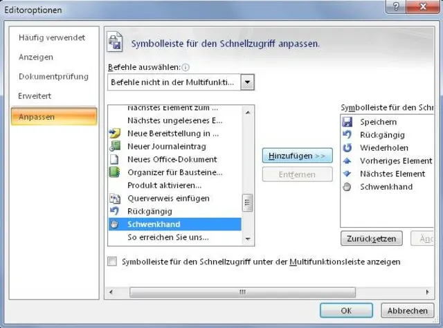 Quelle: PCtipp.chGehen Sie oben bei «Befehle auswählen» zu «Befehle nicht in der Multifunktionsleiste». Klicken Sie dort auf Schwenkhand und anschliessend auf Hinzufügen. Damit können Sie nun die nervige Hand nach Herzenslust ein- und ausschalten. (PCtipp-Forum)