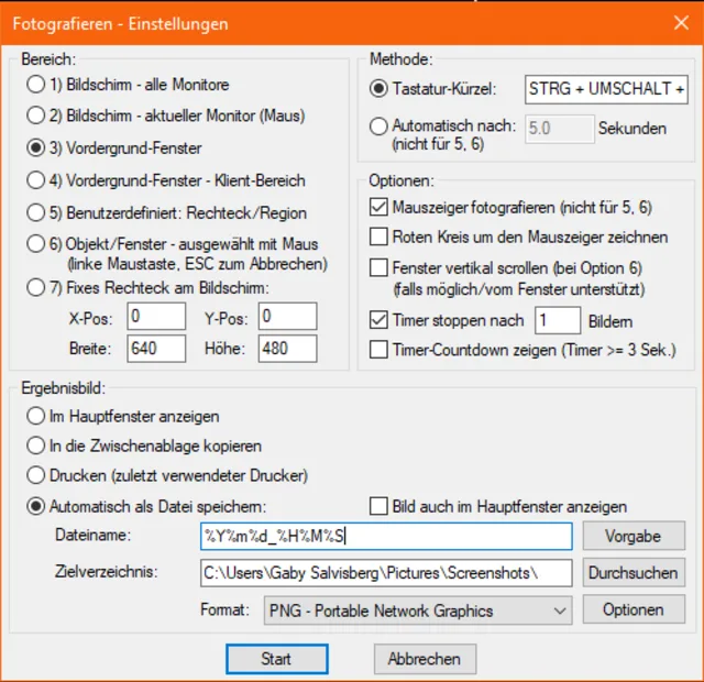 Ist alles passend eingestellt, klicken Sie auf Start. Das IrfanView-Fenster minimiert sich. Wechseln Sie nun zum Fenster, das Sie knipsen wollen und halten Sie den Mauszeiger an die gewünschte Stelle (falls Sie ihn mit auf dem Bild haben wollen). Drücken Sie die festgelegte Tastenkombination, landet das Fenster als Bild im von Ihnen definierten Ordner. Solange im Hintergrund diese IrfanView-Session läuft, können Sie nun mit Ihrem Tastenkürzel ein Fenster nach dem anderen knipsen.