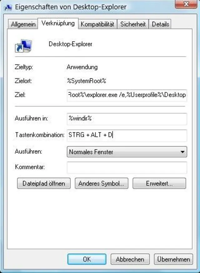Quelle: PCtipp.chAls Name für die Verknüpfung geben Sie beispielsweise «Desktop-Explorer» ein. Klicken Sie die neue Verknüpfung mit Rechts an, öffnen die Eigenschaften und wechseln gegebenenfalls ins Register Verknüpfung. Nach einem Klick ins Feld «Tastenkombinationen» drücken Sie einfach die gewünschte, z. B. Ctrl+Alt+D.