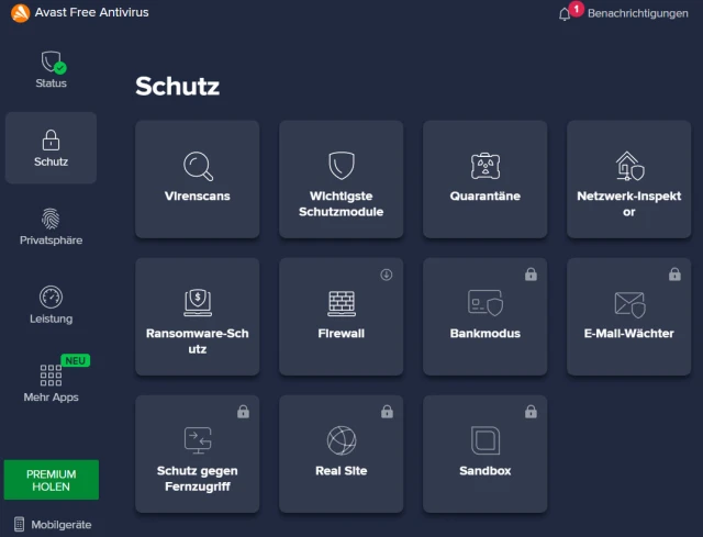 Bild 1: Avast Free Antivirus bietet nebst Virenscan auch noch Firewall und WLAN-Sicherheit
