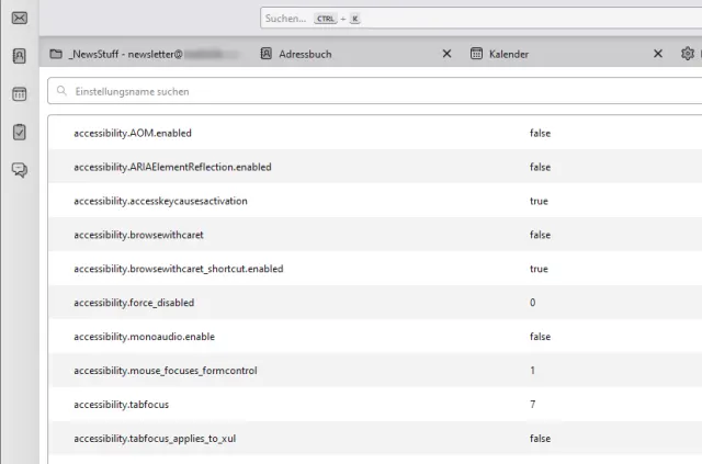 Manchmal kann es erforderlich sein, Voreinstellungen von Thunderbird anzuzeigen oder zu bearbeiten, die nicht über die normale Benutzeroberfläche erreichbar sind. Diese sind in den erweiterten Einstellungen zugänglich.