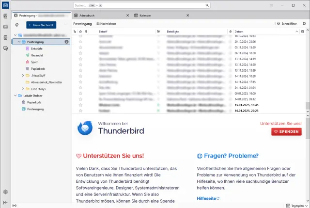 Bild 5: Der E-Mail-Client Thunderbird gliedert sich in Ordnerbereich, Nachrichtenbereich und Lesebereich nebst Symbol- und Statusleiste