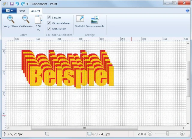 Wer gerne pixelgenau arbeiten möchte, findet unter Ansicht auch noch Lineale und Gitternetzlinien. Für Feinarbeiten empfiehlt sich ein Zoom, mit dem Sie bis 800 % vergrössern können. Damit erlaubt Paint die Kontrolle über jeden einzelnen Pixel.