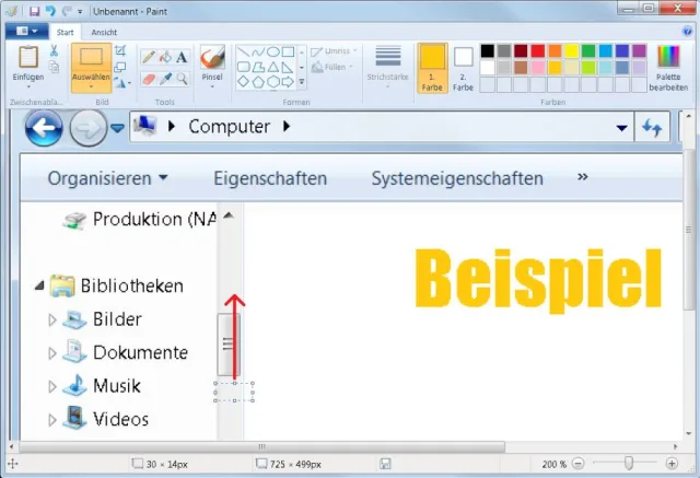 In Paint lassen sich Bereiche horizontal oder vertikal kopieren. In unserem Screenshot wollen wir zum Beispiel den Anfasser des linken Scrollbalkens herausnehmen und ihn durch den normalen Scrollbalken-Hintergrund ersetzen. Erstmal etwas heranzoomen: Ctrl bzw. Strg gedrückt halten und am Mausrad um einen Ticker drehen. Nun gehts oben zu Auswählen. Markieren Sie den Teil des zu kopierenden Bereichs.