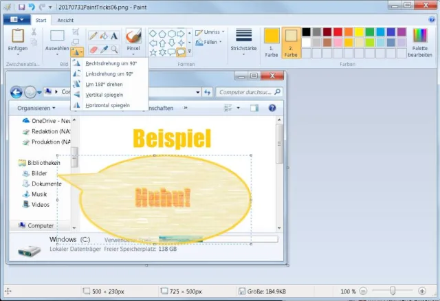 Quelle: PCtipp.chGreifen Sie oben im Bereich Bild zum Icon für Drehen. Mit einer Rechts- oder Linksdrehung um 90° richten Sie beispielsweise eine Sprechblase anders aus. Solange die Form markiert ist, können Sie auch die Grösse beliebig anpassen und die Form an die gewünschte Position ziehen.