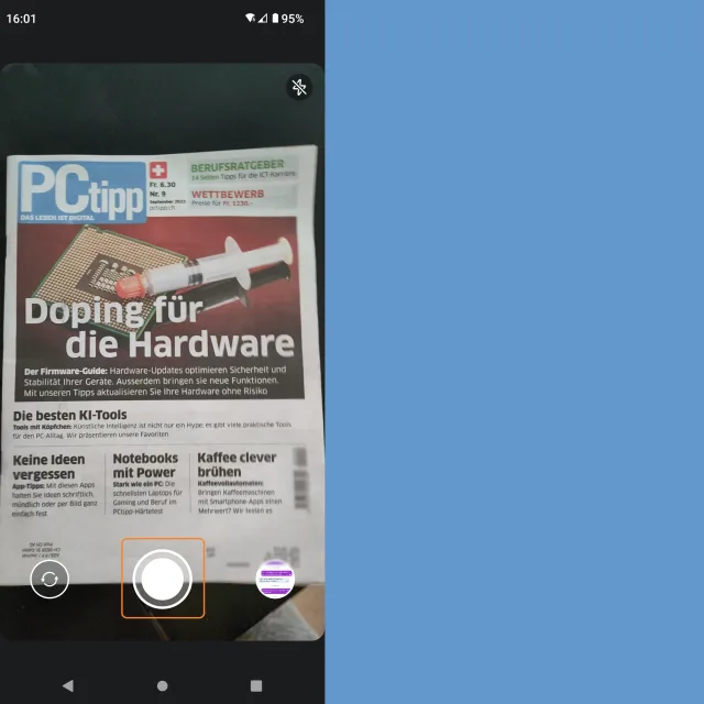 Quelle: PCtipp.chEs öffnet sich die Foto-App. Nehmen Sie das Dokument so ins Visier, dass es möglichst im Vollbild noch Platz hat und alles Wichtige drauf ist. Tippen Sie unten mittig aufs grössere weisse Kreis-Symbol, um das Foto zu knipsen.