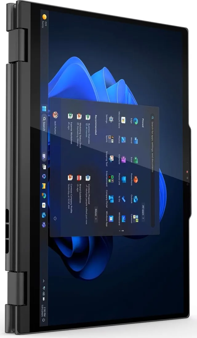 Innen drin ist die Technik auf dem neuesten Stand: Angetrieben wird das Convertible von Intels Core Ultra 7 255U. Dieser 12-Kern-KI-Prozessor der zweiten Generation erreicht Taktfrequenzen von bis zu 5,2 GHz. Ihm zur Seite stehen ein 1 Terabyte grosser SSD-Datenspeicher sowie 32 GB DDR5-Arbeitsspeicher. Das ist üppig. Diese potente Kombination liefert die notwendige Rechenleistung für anspruchsvolle Business-Anwendungen. Zusätzliche Funktionen wie die KI-gestützte Rauschunterdrückung und Wi-Fi 7 optimieren das Nutzungserlebnis in digitalen Meetings und bei der Datenübertragung.