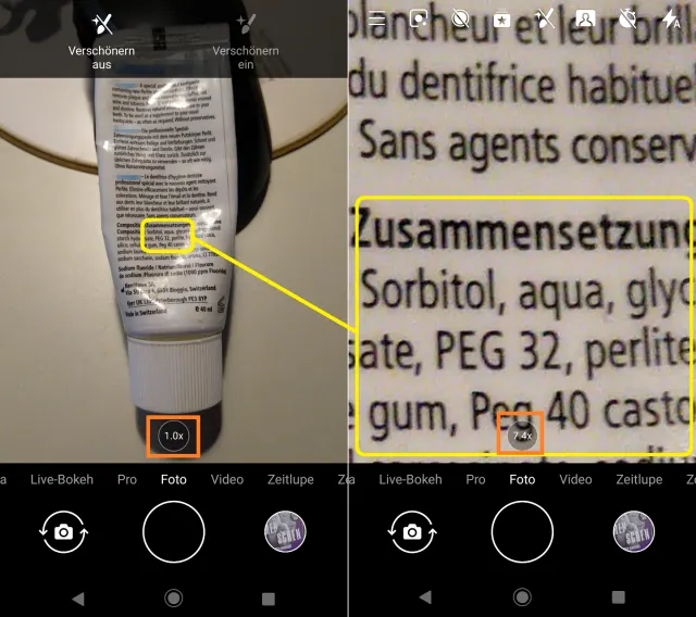 Obiges dürfte mit jeder Kamera-App auf jedem Smartphone klappen, sowohl unter Android als auch mit dem iPhone. Fürs iPhone gibts hier sonst noch den Tipp, wie Sie praktisch dasselbe auch mit der Lupen-Funktion aus den Bedienungshilfen erreichen.